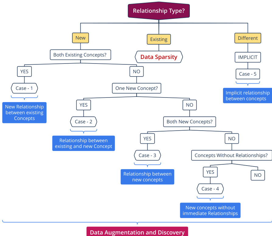 在概念识别之后,该方法专注于提取非分类关系,如属性、主题角色、整体 - 部分关系和因果关系。系统根据底层概念的状态(现有概念与新概念)对关系类型进行分类,以处理数据稀疏性并促进发现。关系类型的决策过程在流程图中详细说明,该图分支为现有概念之间的新关系、涉及新概念的关系以及隐含关系等情形。