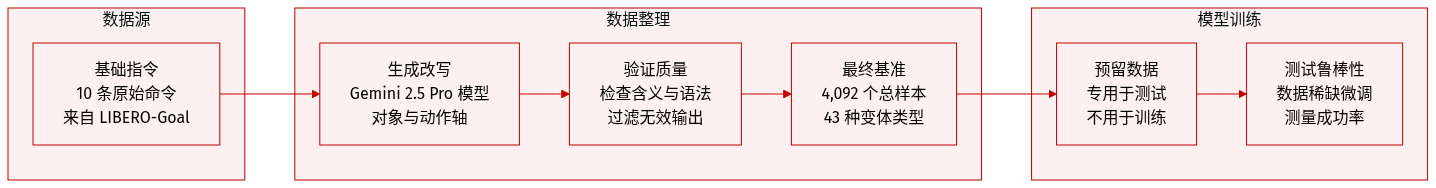 - 研究团队介绍了 LIBERO-Para,这是一个受控基准,独立变化动作表达和对象引用,以评估视觉 - 语言 - 动作模型中的改写鲁棒性。这种双轴设计支持跨 43 种基于语言的指令类型的细粒度分析。