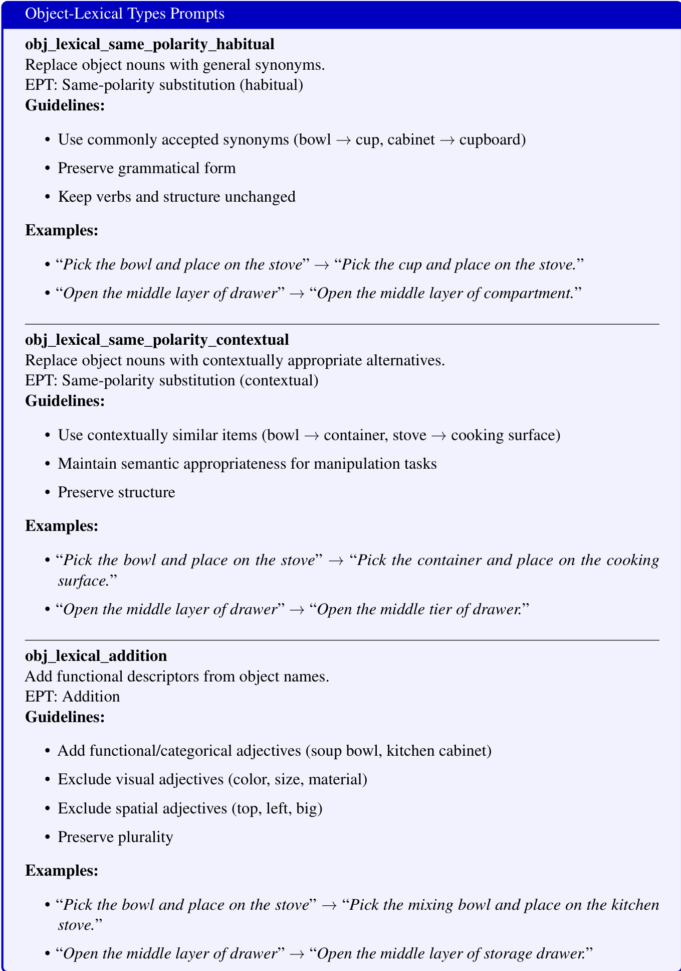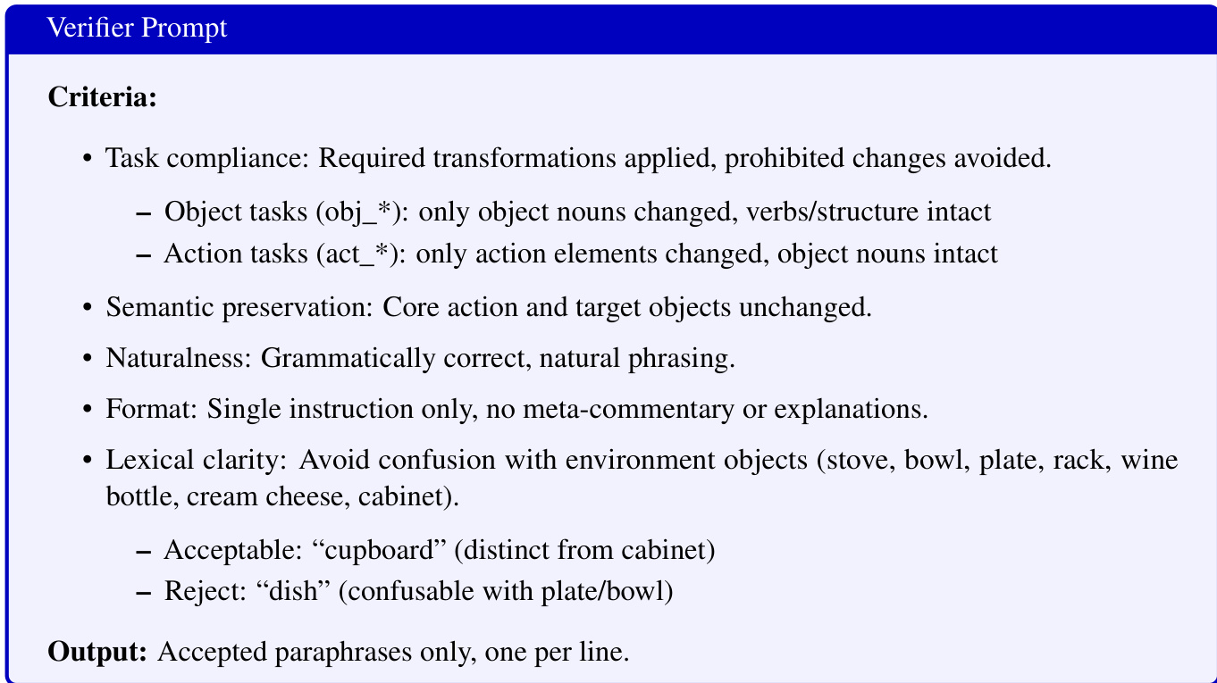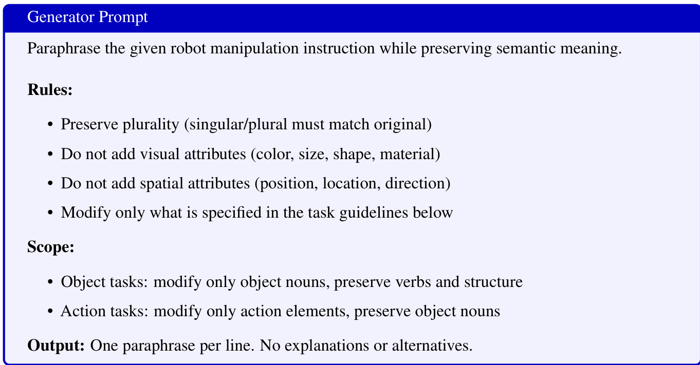 作者利用多阶段框架生成和评估改写的机器人操作指令,中心是基于大语言模型 (LLM) 的管道,该管道考虑了自然语言中的语义和句法变化。整个过程始于指令输入,该输入通过改写生成器处理以生成候选改写。该生成器在旨在保留核心任务语义的一组约束下运行,包括保持复数和避免添加视觉或空间属性等规则。生成的改写随后由第二个 LLM 组件验证,该组件检查是否符合特定任务标准,包括动作和对象实体的语义保留、语法正确性以及遵守单指令格式。该框架采用模块化设计,其中生成器和验证器独立运行但链式连接,以确保输出改写既具有语言多样性又对原始指令语义忠实。