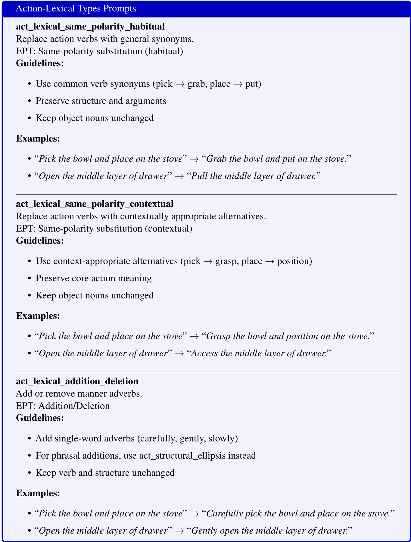 动作变化是框架的关键组件,捕捉动作如何通过三种不同类型在语言上表达:词汇、结构和语用。词汇变化涉及词级同义词替换和副词插入,而结构变化改变句级结构,如并列和从属。语用变化包括间接言语行为,如嵌入的祈使句或问题。这些变化类型基于既定的语言分类,并用于系统生成多样的改写。如下图所示,该框架对这些变化进行分类并评估其对任务成功率的影响,热图说明了不同改写类型如何影响各项任务的性能。
