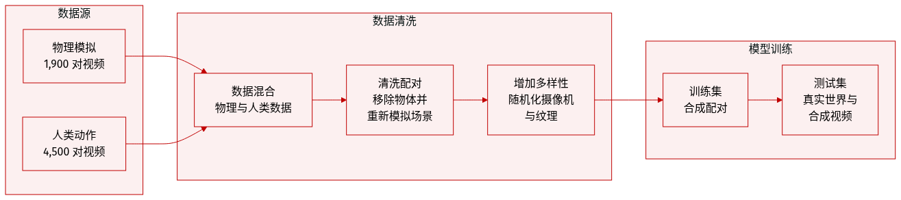 - 刚体动力学 (Kubric): 使用基于物理的模拟生成了约 1,900 对视频。这些视频通过对多个物体的各种初始位置和速度进行采样,模拟了碰撞、坠落和结构依赖。