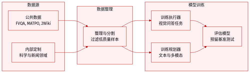 - 内部多模态集: 构建了两个自定义子集以解决特定领域的问题。内部 1 包括 295 个科学领域(如物理和化学)的示例,通过爬取文本、合成 QA 对和检索匹配图像创建。内部 2 由 505 个来自动态领域(如体育和娱乐)的示例组成,这些示例源自新闻语料库,其中 Qwen2.5-VL-72B-Instruct 锚定视觉实体以构建复杂的多跳问题。