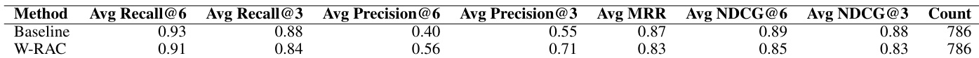 作者从多个指标的检索质量方面将 W-RAC 与基准方法进行了比较。结果显示,W-RAC 在保持竞争力的召回率和排序分数的同时,实现了更高的精确度,表明检索结果的相关性有所提高。与基准相比,W-RAC 在所有评估指标上都提高了精确度。尽管精确度更高,W-RAC 仍保持了具有竞争力的召回率和排序质量。检索结果表明,在其他指标权衡极小的情况下,精确度实现了持续增长。