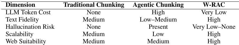 作者从成本、保真度和扩展性等关键维度比较了传统分块、agentic chunking 和 W-RAC。结果显示,W-RAC 在文本保真度和扩展性方面表现出高性能,同时最大限度地降低了幻觉风险和 LLM token 成本。与传统和 agentic chunking 相比,W-RAC 实现了高文本保真度和低幻觉风险。W-RAC 展示了高扩展性和 Web 适用性,在这些维度上优于其他方法。W-RAC 的 LLM token 成本非常低,使其比传统和 agentic chunking 方法更高效。