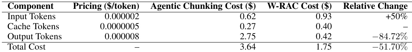 作者比较了 Agentic Chunking 和 W-RAC 的成本效率,重点关注输入、缓存和输出 token 的消耗。结果显示,W-RAC 在增加输入 token 使用量的同时,显著降低了输出 token 成本和总体支出,从而实现了大幅成本节约。尽管输入 token 消耗较高,该方法仍保持了具有竞争力的检索性能。与 Agentic Chunking 相比,W-RAC 降低了 80% 以上的输出 token 成本;W-RAC 虽然增加了 50% 的输入 token 使用量,但实现了显著的整体成本节约;W-RAC 的总成本远低于 Agentic Chunking,证明了其成本效率的提升。