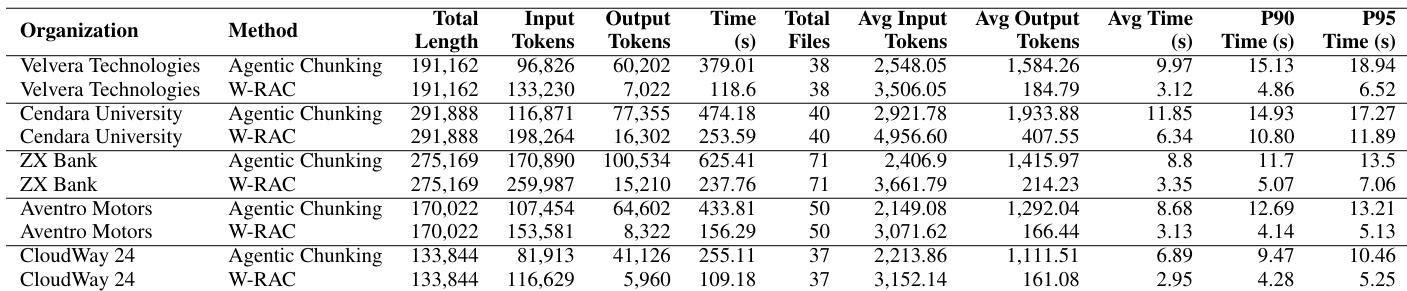 作者在多个组织中将 W-RAC 与传统的 agentic chunking 进行比较,评估了 token 使用量、处理时间和成本效率。结果显示,W-RAC 在增加输入 tokens 的同时,显著减少了输出 tokens 和处理时间,从而实现了大幅成本节约。尽管输入 token 使用量较高,W-RAC 仍保持了具有竞争力的检索性能,并在精确度方面有显著提升。与 agentic chunking 相比,W-RAC 大幅减少了输出 tokens 和处理时间。W-RAC 增加了输入 tokens,但由于较低的输出 token 消耗,实现了实质性的成本节约。W-RAC 在所有组织和查询类型中都提高了检索精确度,同时保持了具有竞争力的召回率和排序质量。