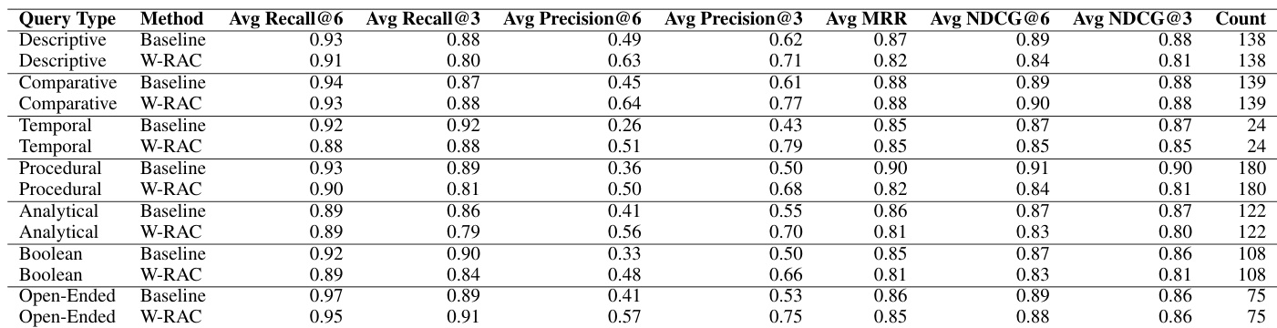 作者在各种查询类型下将 W-RAC 与基准方法进行比较,使用标准指标评估检索有效性。结果显示,W-RAC 在所有查询类别中都实现了更高的精确度,同时保持了具有竞争力的召回率和排序质量。W-RAC 提高了所有查询类型的精确度,其中在时序和比较查询中的提升最为显著。尽管精确度更高,W-RAC 仍保持了具有竞争力的召回率和排序指标。精确度的提升在描述性、程序性、分析性和开放式查询中表现一致。