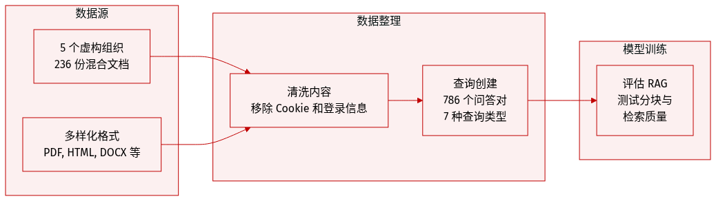 - 数据集组成与来源:该基准测试由来自五个虚构组织的 236 份文档组成。这些文档涵盖了多种企业格式,如 PDF、Markdown、HTML、DOCX 和 PPTX,以反映生产级 RAG 流水线的异构性。