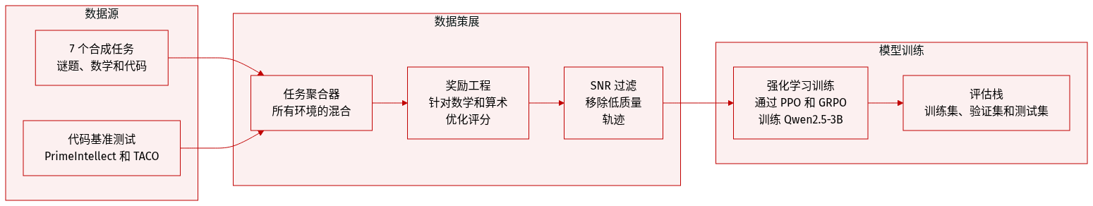 数据集组成与来源:作者利用了由七个合成且完全可控的环境组成的多元测试平台,旨在评估各种决策机制。这些环境包括 Sokoban(网格谜题)、FrozenLake(导航)、MetaMathQA(数学推理)、Countdown(算术游戏)、SearchQA(多轮搜索)、WebShop(电子商务导航)和 DeepCoder(程序综合)。DeepCoder 特别借鉴了 PrimeIntellect、TACO 和 LiveCodeBench v5。
