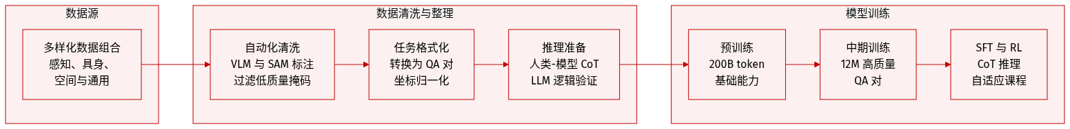 - Pre-training 与 Mid-training:pre-training 混合物由超过 200B tokens 的空间、机器人和感知数据组成。mid-training 阶段利用了超过 12M 高质量的 QA 对。