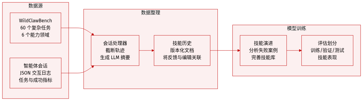 作者利用一个以 WildClawBench 为核心的专门数据框架和一个结构化的 agent 会话仓库来驱动技能进化。数据集的组成和处理细节如下: