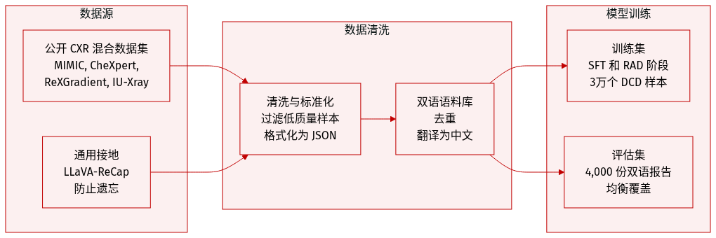 - 评估:评估集由从归一化的 MIMIC-CXR、CheXpert-Plus 和 ReXGradient 数据集中抽取的 2,000 份英语报告和 2,000 份中文报告组成,以确保语言和来源的均衡覆盖。