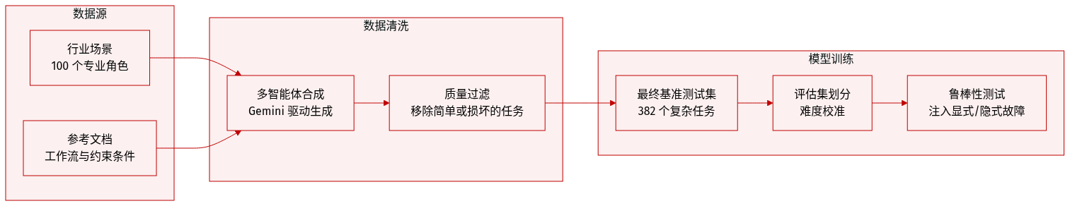数据集组成与来源:作者开发了 OccuBench,这是一个由 382 个可解任务实例组成的基准测试。这些实例涵盖了跨越 10 个行业类别和 65 个专业领域的 100 个专业任务场景。为了确保高质量和结构多样性,作者使用了由 Gemini-3-Flash-Preview 驱动的 multi-agent 合成流水线来生成环境配置、任务指令、工具定义和验证标准。