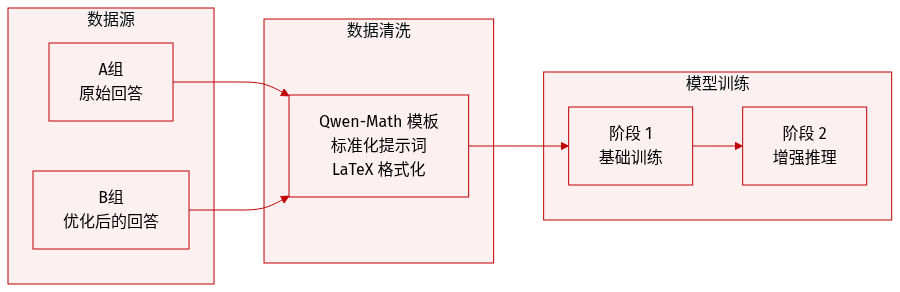 - 训练阶段: 数据应用于多阶段训练方法,其中 Group A 作为基础训练集,Group B 在随后的阶段中被整合以增强推理能力。