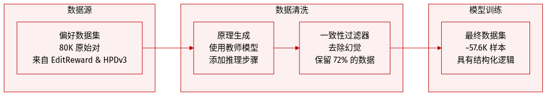 - 理由生成: 由于源数据集仅提供二元或排序标签,作者使用 PARROT 流水线,以 Qwen3-VL-32B-Instruct 作为教师模型,将原始偏好对转换为包含结构化推理理由的训练数据。