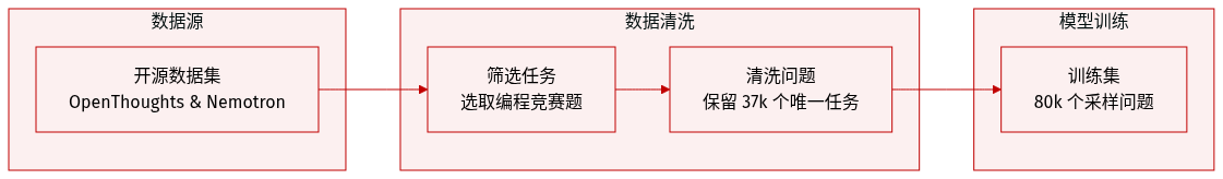 - 选择与过滤:为了确保任务相关性,作者使用了精心设计的提示词来引导 GPT-OSS-120B 选择专门与编程竞赛相关的样本。在此过程中,原始回答被丢弃,仅保留相应的题目。