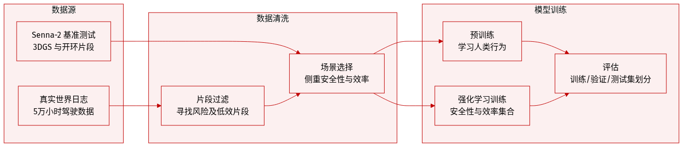 - 训练集:创建了两个经过策划的训练集用于闭环强化学习,每个训练集包含 10,000 个片段,分别侧重于安全或效率目标。