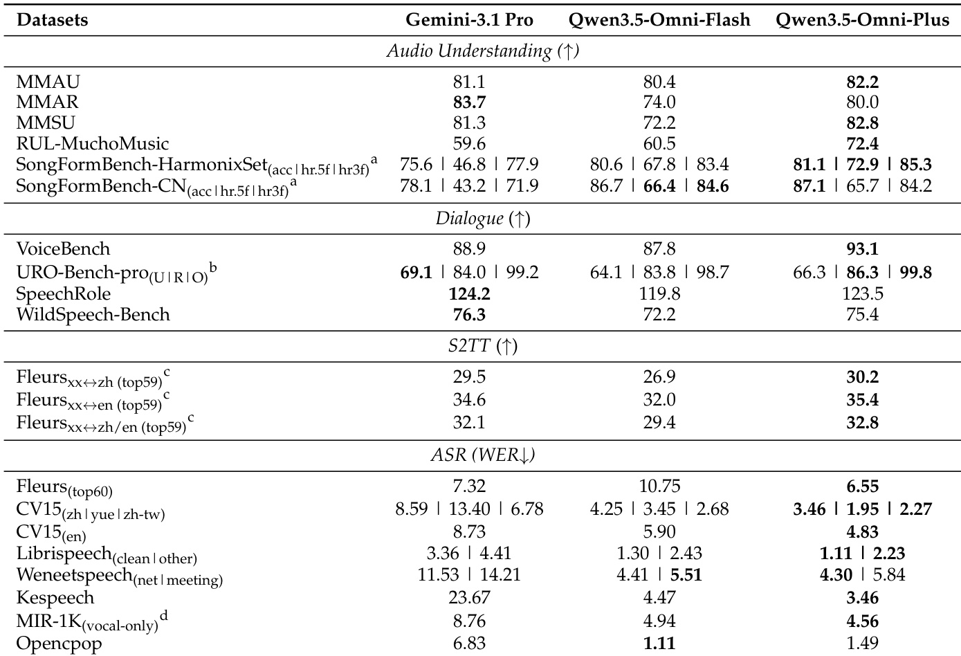作者在音转文任务上将 Qwen3.5-Omni-Flash 和 Qwen3.5-Omni-Plus 与 Gemini-3.1 Pro 进行了比较,评估了音频理解、对话、翻译和语音识别。结果显示,Qwen3.5-Omni 在大多数基准测试中实现了优于或相当的性能,特别是在音频理解和语音识别方面,同时在语音转文本翻译方面优于 Gemini-3.1 Pro。Qwen3.5-Omni 在多个音频理解和语音识别基准测试中优于 Gemini-3.1 Pro。与 Gemini-3.1 Pro 相比,Qwen3.5-Omni 在端到端语音对话任务中取得了具有竞争力的结果。Qwen3.5-Omni 在各种语言对的语音转文本翻译中展示了强大的性能。