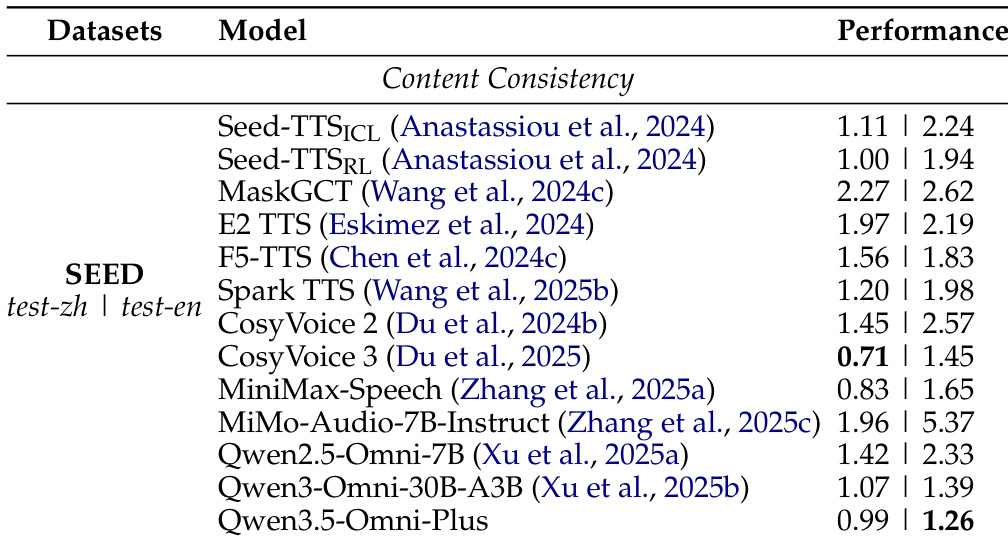 作者在 SEED 基准测试上评估了零样本语音生成,将 Qwen3.5-Omni-Plus 与几种最先进的模型进行了比较。结果显示,Qwen3.5-Omni-Plus 实现了强大的内容一致性,其性能与领先系统相当,并在优化后在自然度方面有显著提升。与最先进的模型相比,Qwen3.5-Omni-Plus 在 SEED 基准测试上实现了具有竞争力的内容一致性。模型在 RLHF 优化后展示了改进的生成稳定性和自然度。Qwen3.5-Omni-Plus 在零样本语音生成中表现出强大的性能,在多个评估指标上均具有较低的错误率。