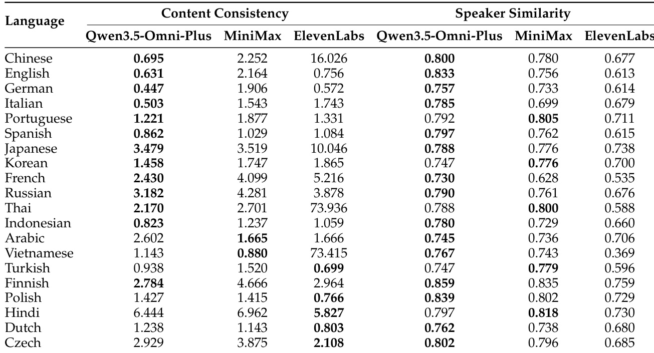 该表比较了 Qwen3.5-Omni-Plus 与其他系统在多种语言下的多语言语音生成性能,衡量了内容一致性和说话人相似度。结果显示,Qwen3.5-Omni-Plus 在大多数语言中实现了具有竞争力的内容一致性和卓越的说话人相似度,特别是在日语和韩语方面表现出色。Qwen3.5-Omni-Plus 在 29 种语言中的 22 种中实现了最低的词错误率,表明了强大的内容一致性。Qwen3.5-Omni-Plus 在说话人相似度方面优于其他系统,尤其是在日语和韩语中。该模型在多种语言中保持了高性能,展示了强大的多语言泛化能力。