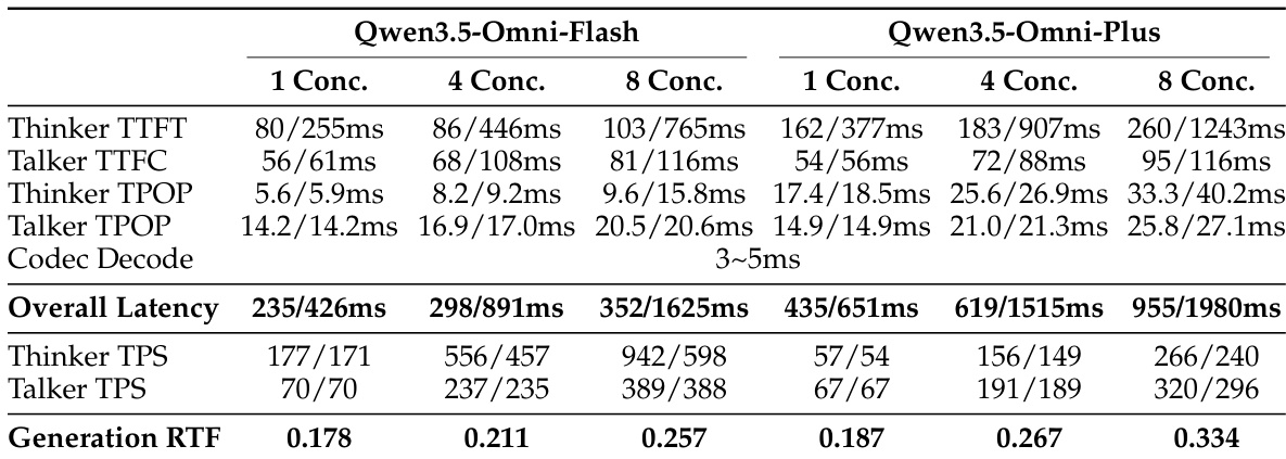 该表展示了 Qwen3.5-Omni-Flash 和 Qwen3.5-Omni-Plus 在不同并发水平下的延迟和吞吐量指标,显示出随着并发增加,性能保持稳定。结果表明,两种模型都保持了低延迟和一致的生成吞吐量,较大的变体展示了更高的绝对值,但具有相似的扩展行为。对于两种模型变体,延迟随着并发的增加保持稳定。两种模型在不同的并发水平下都显示出一致的生成吞吐量。Qwen3.5-Omni-Plus 的绝对延迟和吞吐量值高于 Qwen3.5-Omni-Flash。