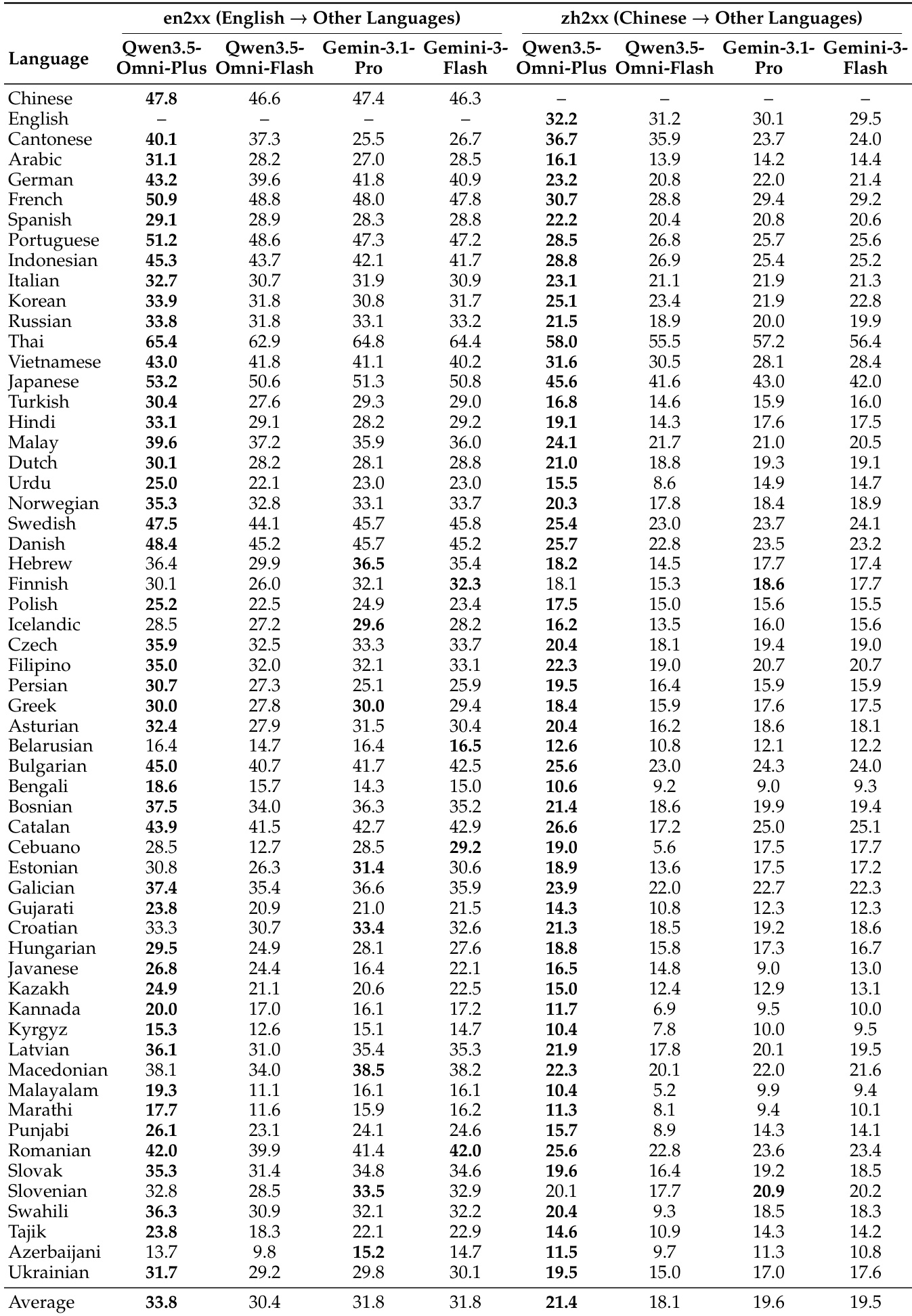 该表比较了 Qwen3.5-Omni 各变体与 Gemini-3.1-Pro 在多种语言下的多语言语音生成性能。结果显示,Qwen3.5-Omni-Plus 和 Qwen3.5-Omni-Flash 在大多数语言中实现了具有竞争力或优越的性能,特别是在内容一致性和说话人相似度指标方面。在从英语和中文到其他语言的翻译任务中,Qwen3.5-Omni 变体在大多数语言上都优于 Gemini-3.1-Pro。Qwen3.5-Omni-Plus 在几种语言中获得了最高分,表明了强大的多语言语音生成能力。Qwen3.5-Omni-Flash 展示了具有竞争力的性能,特别是在其结果匹配或超过 Gemini-3.1-Pro 的语言中。