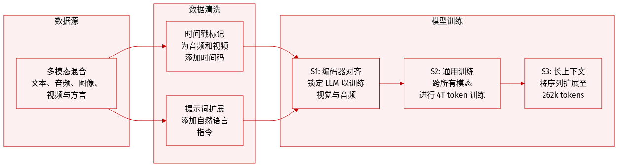 - Long Context 阶段 (S3): 为了提高长序列理解能力,作者将最大序列长度增加到 262,144,并提高了长音频和长视频数据的比例。