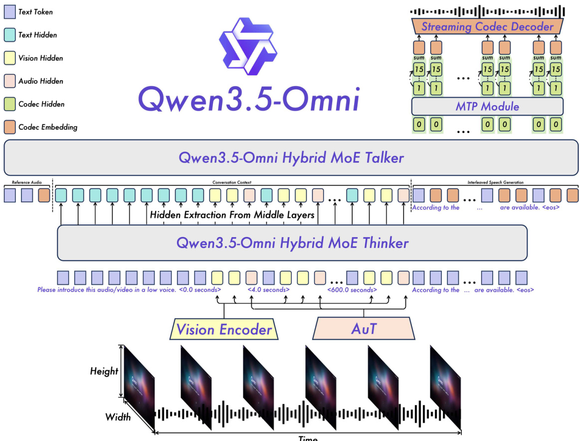 Qwen3.5-Omni 系统采用了 Thinker-Talker 架构,专为超低延迟的端到端多模态交互而设计。如框架图所示,模型结构分为两个主要组件:Thinker 和 Talker。Thinker 负责多模态理解和文本生成,而 Talker 则根据 Thinker 产生的高层表示来生成流式语音 tokens。这种分离实现了具有极低延迟的高效实时语音合成。