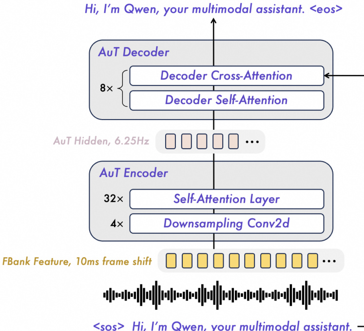 如图所示,AuT encoder 是一个基于 transformer 的音频 encoder,在 4000 万小时的音文对上从头开始训练。它使用四个 Conv2D 块对滤波器组特征进行下采样,并通过自注意力层进行处理,以获得 6.25 Hz 速率的音频 tokens。该 encoder 使用动态注意力窗口大小机制进行训练,以平衡实时预填充缓存和离线音频理解任务的性能。这种设计使模型能够处理扩展输入,支持高达 256k tokens、10 小时音频或 400 秒 1 FPS 的 720P 视频。