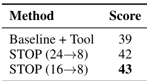 作者在工具增强的推理设置中比较了不同的剪枝方法,结果显示 STOP 方法获得了最高分。结果表明,与使用工具的基线相比,在减少初始路径数量的同时使用 STOP 方法可以提高性能。在工具增强的推理中,STOP 方法优于带有工具的基线。将初始路径从 24 条减少到 8 条可以提高使用 STOP 方法时的性能。通过将 16 条初始路径减少到 8 条,STOP 方法获得了最高分。