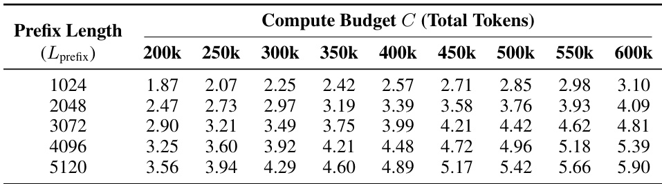 该表展示了不同计算预算和前缀长度下的最佳保留率,显示了最佳比例如何随着计算资源和上下文长度的增加而变化。数值随着更高的计算预算和更长的前缀长度而增加,这表明随着更多资源和上下文的可用,更激进的剪枝变得可行。最佳保留率随着更高的计算预算和更长的前缀长度而增加。更高的计算预算允许更激进的剪枝策略。更长的前缀长度允许更高的保留率,表明决策时拥有更丰富的上下文。