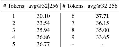 该表显示了 token 数量与平均准确率之间的关系,其中性能在特定的 token 计数处达到峰值,然后开始下降。这表明在任务中存在 token 使用的最佳点。准确率在 6 个 tokens 时达到峰值,然后随着进一步增加而下降。存在一个最大化平均准确率的最佳 token 计数。性能在超过最佳 token 计数后会下降。
