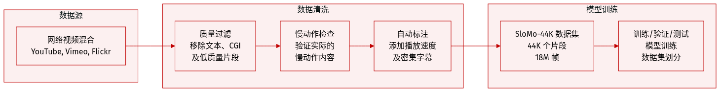 - 组成与来源: 该数据集包含 44,632 个慢动作视频片段,总计 1,800 万帧。原始视频材料通过与高帧率和慢动作相关的查询,从 YouTube、Vimeo 和 Flickr 获取。