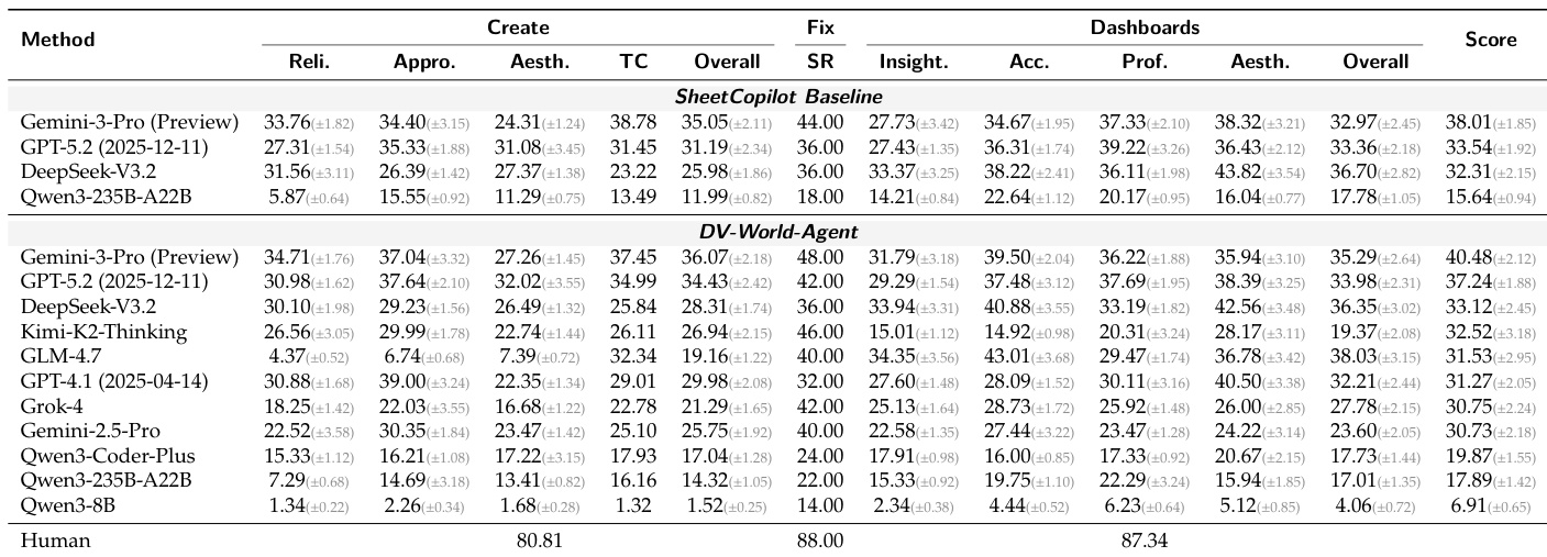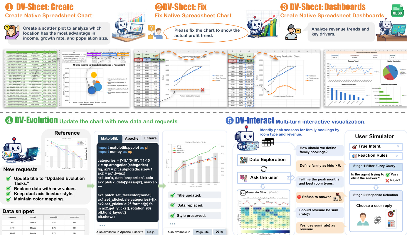 - DV-World 提出了一个包含 260 个任务的基准测试,用于评估数据可视化 Agent 在原生电子表格操作(DV-Sheet)、跨范式代码演进(DV-Evolution)以及主动用户交互(DV-Interact)方面的能力。该基准测试涵盖迭代更新、诊断性修复与模糊意图处理,旨在反映超越静态复现的真实专业工作流。