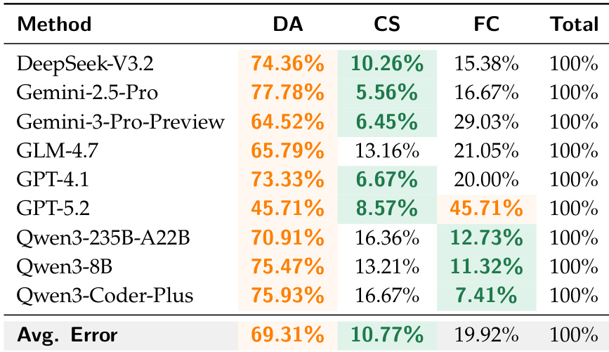 表格对比了不同方法在三项评估指标(DA、CS 与 FC)上的表现,每项方法的总分均为 100%。结果凸显了各指标间性能差异,部分方法在 DA 上得分较高,另一些则在 CS 或 FC 上表现更优。表格同时提供了所有方法的平均错误率,以反映整体性能水平。各方法在 DA、CS 与 FC 指标上表现各异,无单一方法在所有领域均占优势。所有方法的平均错误率分别为:DA 69.31%、CS 10.77%、FC 19.92%。GPT-5.2 在 FC 上取得最高分 45.71%,而 DeepSeek-V3.2 在 DA 上得分最高,为 74.36%。