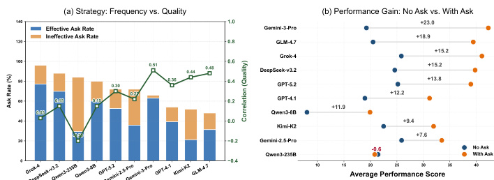 研究分析了交互策略对 Agent 性能的影响,重点考察主动澄清如何影响任务质量与总体得分。结果表明,有效澄清率较高的模型性能更佳,而依赖无效或高频交互却未带来改进的模型则出现收益递减现象。交互频率与质量的关系在不同模型间差异显著,部分模型因针对性提问而受益,另一些则因查询质量差而受噪声干扰。有效澄清显著提升任务质量,模型在提出相关问题时成功率更高。高频交互并不能保证性能提升,部分模型因无效或冗余查询导致性能下降。交互质量与最终得分的相关性各不相同,表明策略性使用澄清机制比单纯增加交互次数更为重要。