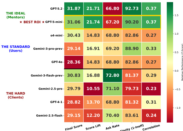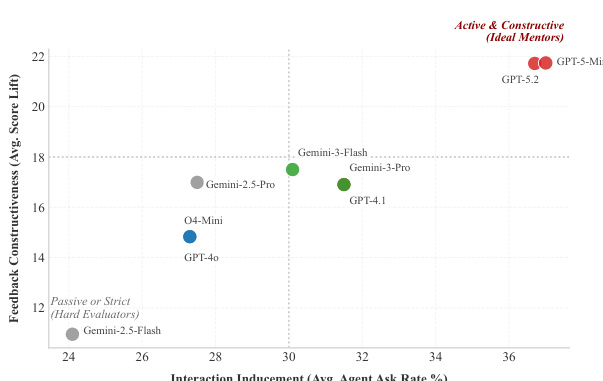 图表展示了不同模型的交互诱导与反馈建设性之间的关系,显示 Agent 提问率较高的模型往往能实现更大的分数提升。GPT-5.2 与 Gemini-3-Flash 位于右上象限,表明其交互频率高且反馈建设性强;Gemini-2.5-Flash 与 GPT-4.0 位于左下象限,反映其交互与反馈指标较低。较高交互率的模型通常能实现更大的分数提升。GPT-5.2 与 Gemini-3-Flash 表现出高交互与高反馈建设性。Gemini-2.5-Flash 与 GPT-4.0 则呈现低交互与低反馈指标。