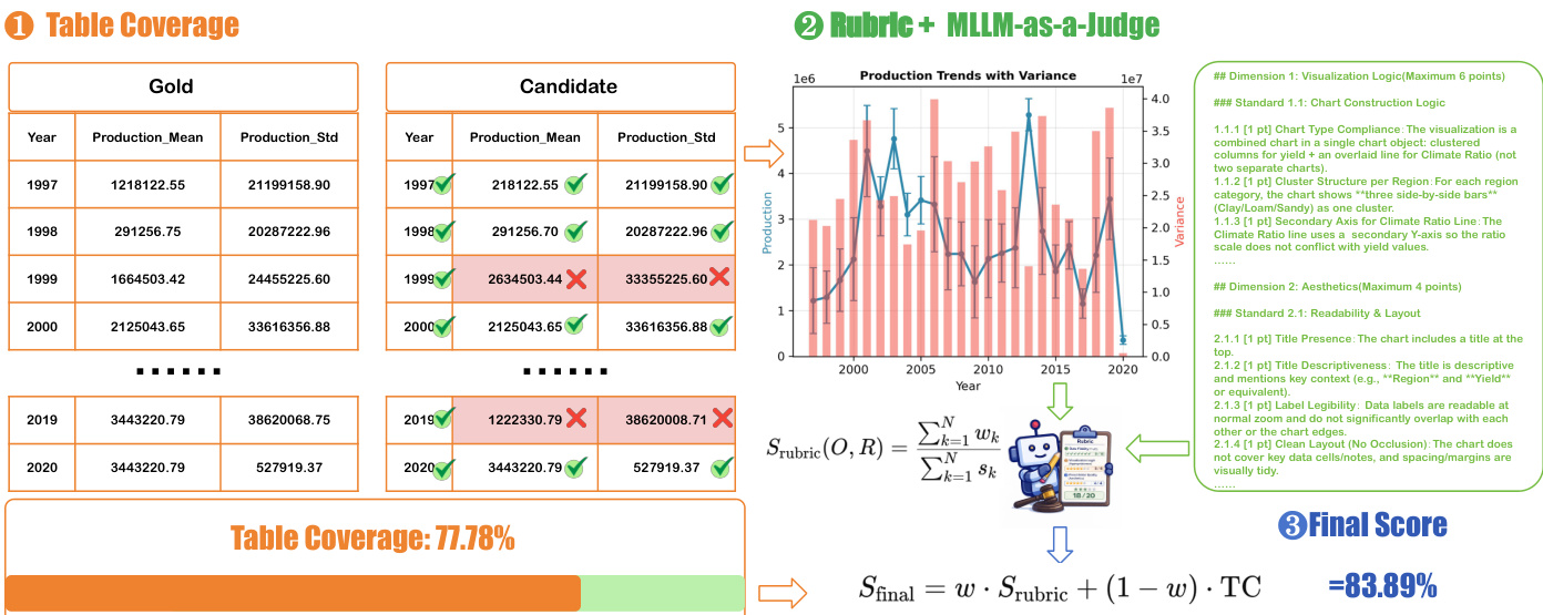 - 混合评估框架将用于保证数值精度的 Table-value Alignment 协议与由专家标注评分标准指导的分层 MLLM-as-a-Judge 系统相结合。该方法在超越传统代码验证的同时,评估数据保真度与视觉语义。