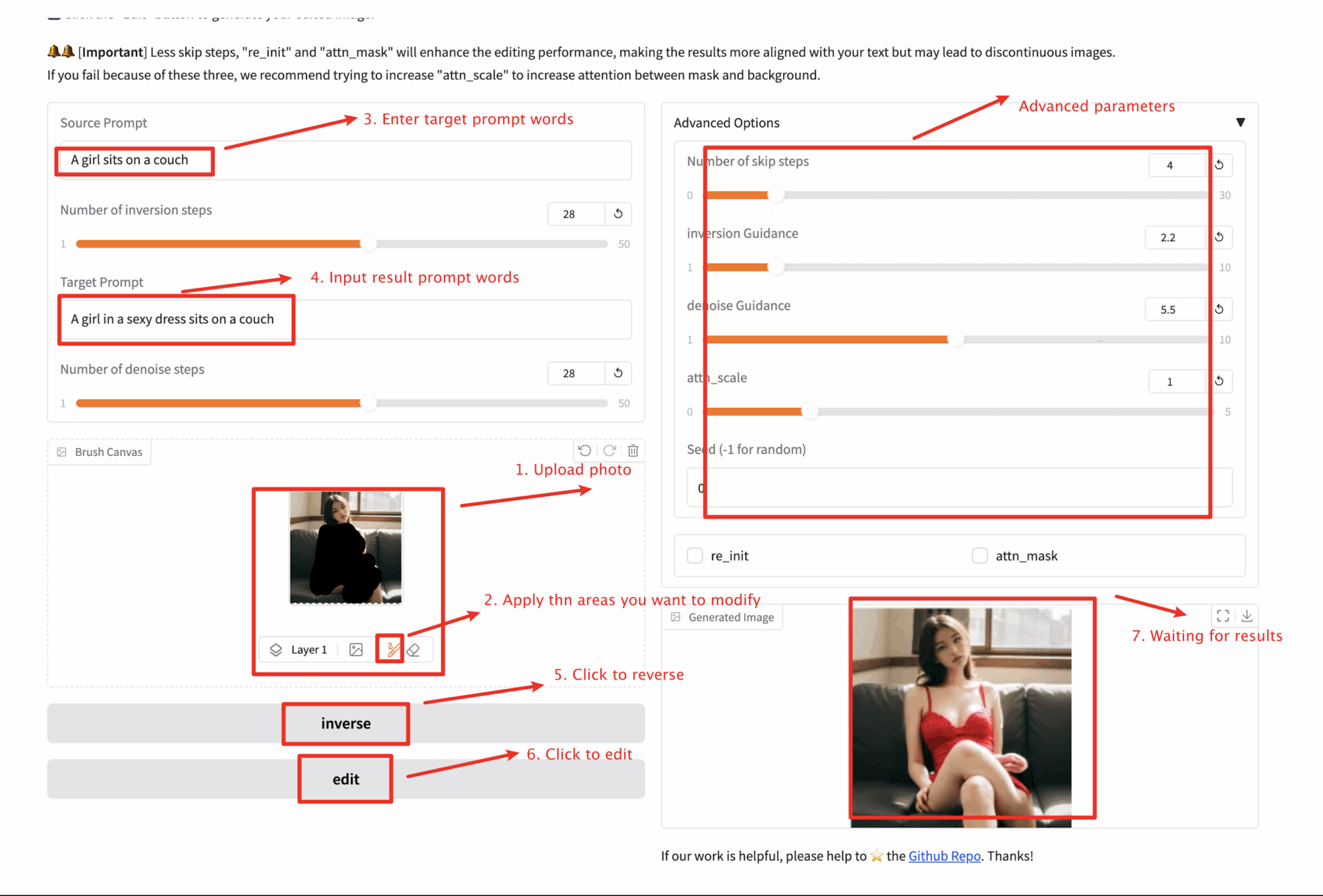- 在使用基于反转的版本时,您只需对每张图片进行一次反转,然后可以重复步骤 3-5 进行多次编辑尝试!