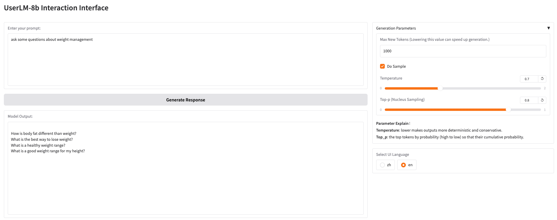 UserLM-8b 是微软于 2025 年 10 月发布的用户行为模拟模型。与在对话中扮演「助手」角色的典型 LLM 不同,UserLM-8b 是用来模拟对话中的「用户」角色(基于 WildChat 对话语料库训练),可以用于大模型助手能力评估。该模型并非常见的大模型助手,不能模拟更真实的对话或者解决问题,但该模型有助于开发更强大的助手。相关论文成果为「Flipping the Dialogue: Training and Evaluating User Language Models」。