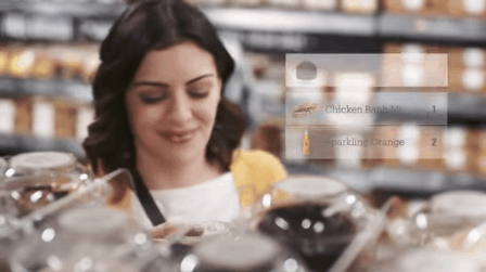 Artikel, die Kunden aus den Regalen nehmen, werden durch Kameras an der Decke und Sensoren an den Regalen verfolgt und dann dem virtuellen Einkaufswagen des Käufers hinzugefügt.