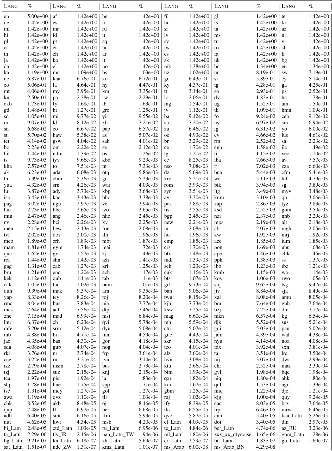 - MADLAD-400 Test Set: For each of the 50 languages, they sample 20M tokens or 20% of total tokens (whichever is smaller), totaling ~20.5M tokens per language, to ensure stable loss measurements using the vocabulary-insensitive metric from Tao et al. (2024).