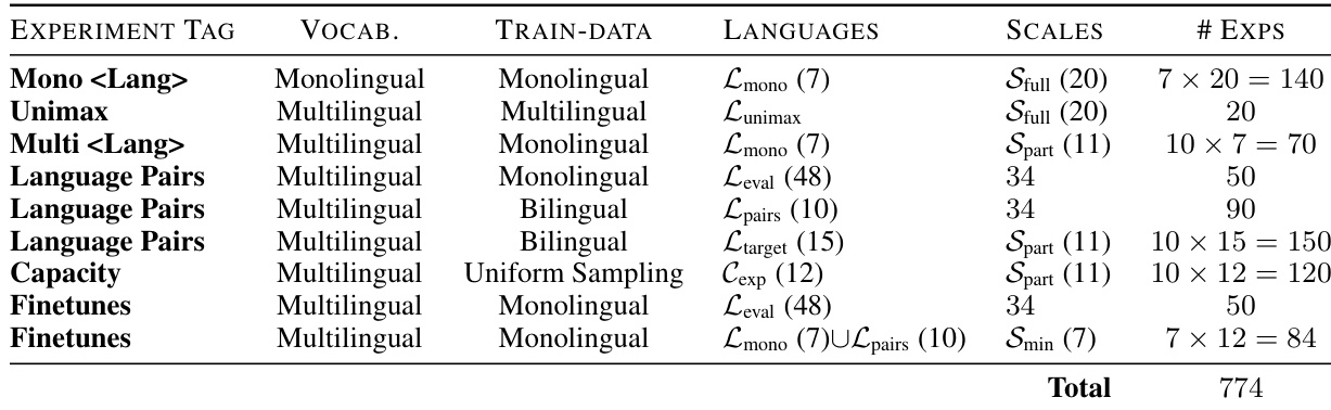 - They train 280 monolingual, 240 bilingual, and 120 multilingual models (including Unimax-style mixtures), plus 130 finetuned models — over 750 total runs.