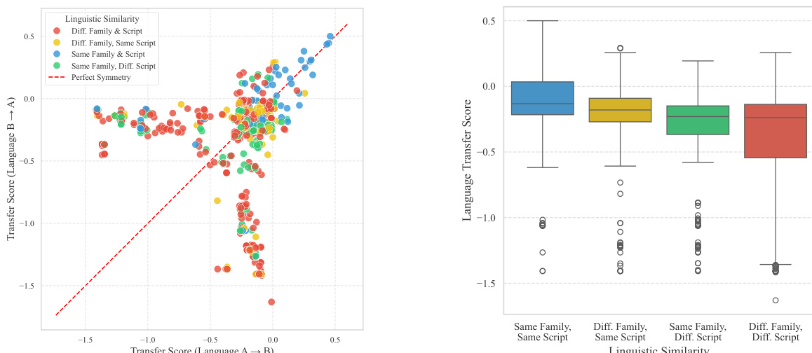 The authors use bilingual transfer scores to measure how training on a source language affects the performance of a target language, finding that language similarity—particularly shared language family and script—strongly predicts positive transfer. Results show that pairs sharing both family and script exhibit the most symmetric and positive transfer, while those with differing family and script show greater asymmetry and negative transfer, with script similarity having a stronger effect than family.