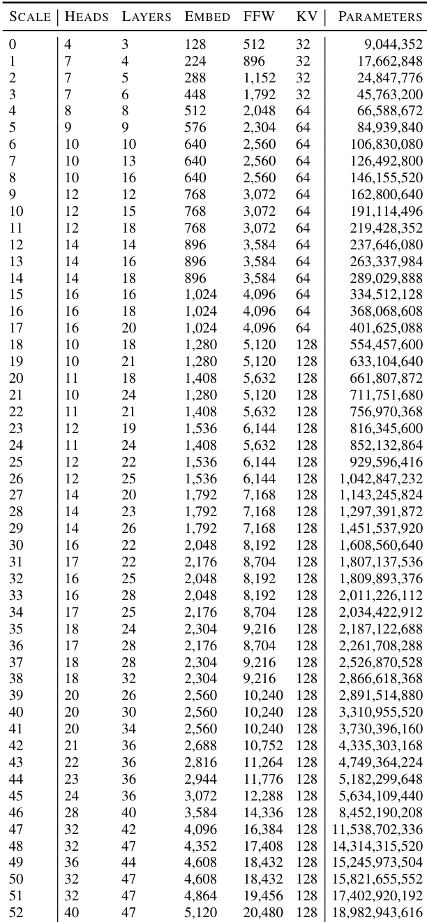 The authors use a range of model scales from 10 million to 8 billion parameters, with varying numbers of attention heads, layers, embedding sizes, and feedforward widths, to study multilingual learning dynamics. The table provides the specific architectural configurations for each scale, which are used in experiments to measure language transfer and model capacity effects.
