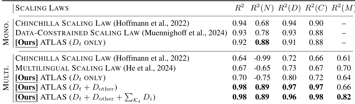 The authors compare scaling laws for monolingual and multilingual models, finding that their proposed multilingual scaling law achieves strong performance across different evaluation metrics. The [Ours] ATLAS (Dt + Dother + ∑κt Di) model outperforms existing baselines, particularly in multilingual settings, with high R² values indicating robust fit and generalization.