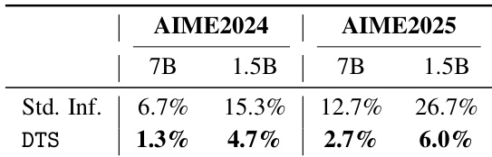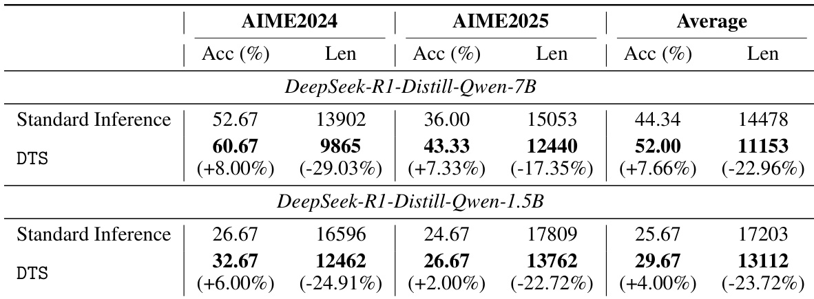 The authors use the DTS framework to improve reasoning performance and efficiency for DeepSeek-R1-Distill-Qwen models on AIME2024 and AIME2025. Results show DTS consistently increases accuracy by 4% to 8% while reducing response length by 17% to 29% compared to standard inference, with the 7B model achieving a 7.66% average accuracy gain and 22.96% length reduction. These improvements hold across both model sizes and datasets, demonstrating DTS’s effectiveness in balancing performance and efficiency without training.