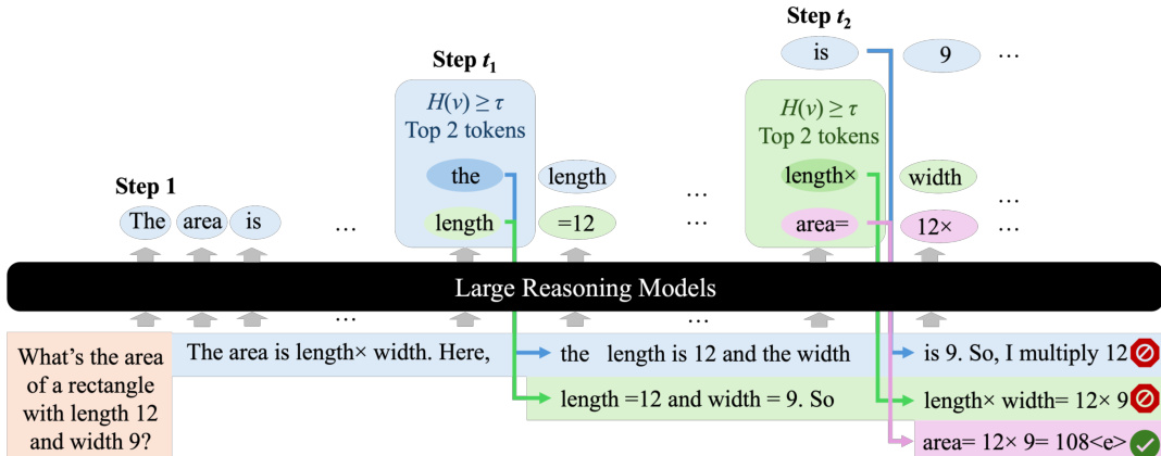 An illustrative example is shown in the figure below, where DTS processes the prompt “What’s the area of a rectangle with length 12 and width 9?”. Branching occurs at steps t1 and t2, generating multiple reasoning paths. The purple branch terminates first with the correct answer “area= 12×9=108”, which is returned as the final output.