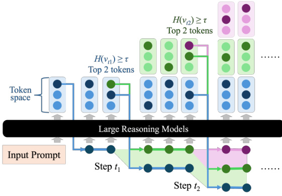 As shown in the figure below, the decoding tree grows in a breadth-first manner, with each node representing a token and edges denoting transitions. Branching occurs only at steps t1 and t2, where entropy exceeds the threshold τ, and the top two tokens are selected for expansion. Low-entropy steps proceed linearly, preserving efficiency.