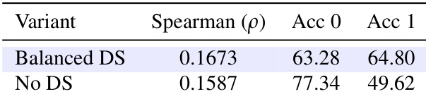 The authors evaluate the impact of class-balanced downsampling on router training, finding that balancing the dataset improves Spearman correlation and label-1 accuracy while reducing bias toward the majority accept class. Without downsampling, the router becomes overconfident in accepting draft steps, leading to under-escalation and worse overall routing quality.
